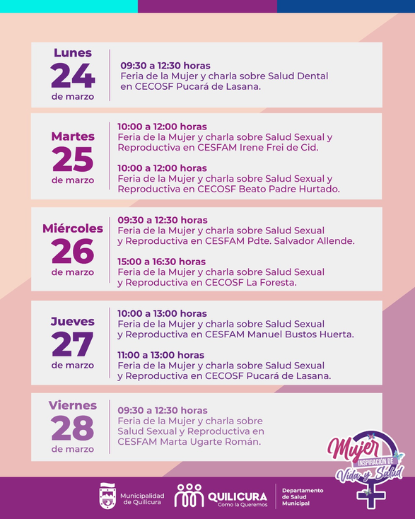 Durante este Mes de la Mujer, queremos promover el cuidado integral e informar a las vecinas sobre distintas temáticas relevantes para nuestro género. Por eso, como Alcaldía Ciudadana hemos preparado con mucho cariño distintas actividades para ustedes y les invitamos a conocerlas en el siguiente calendario: